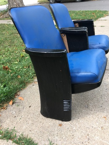 Pair of antique cast iron theater seats. They are in very good condition with just a few minor blemishes to the blue vinyl seats. Great ribbed design on each cast iron panels on each outer side and wood arms on both. They each measure 24” wide x 17” x 32” high. Ready to bolt to floor. No cracks or breaks in the cast iron. Will disassemble the four screws on each side of chair for easier and safer shipping. Please see pics for further description or email for any questions.