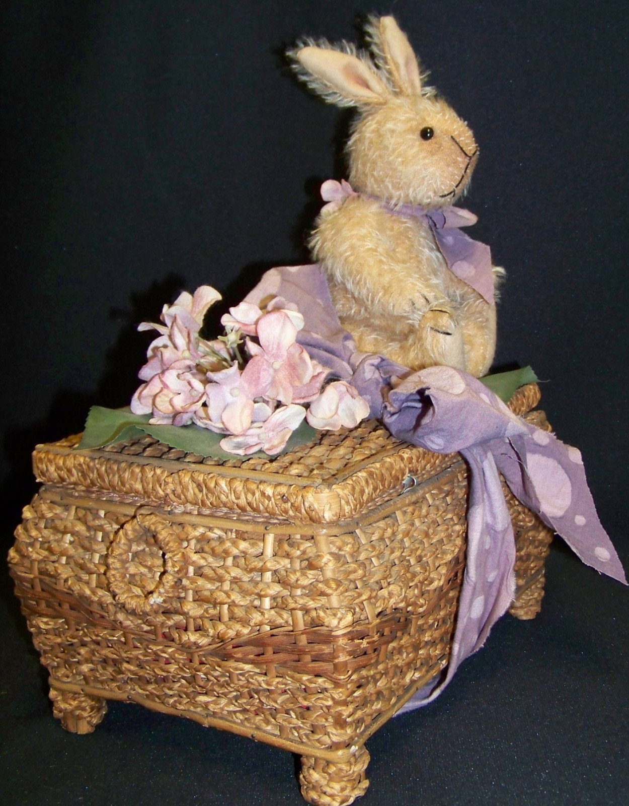 Eastertide is a rabbit by Cindy McGuire for China Cupboard Bears. The rabbit is made of beige mohair, is jointed in 5 places and is 8" tall. She sits atop a vintage basket with vintage trim. The basket measures approx. 10" long and 5 1/4" high. Maine resident please add 5.5% sales tax. We will ship internationally but please call for information before bidding.