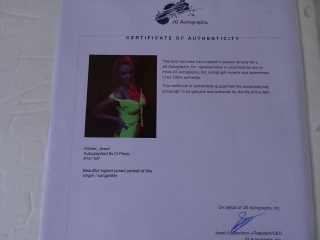 This is a glossy color 8" x 10" autographed photo w/COA of "JEWEL" KILCHER. It's in excellent condition. PayPal, please. I do not accept returns unless I have inadvertently misrepresented something. I appreciate and thank you for viewing my item.