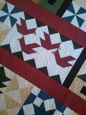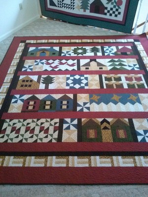 Super festive, ready to ship King Size Christmas Quilt. Notice the super cute cardinals and wrapped gifts, the colorful holly, cozy cabins, and stars perched above a picket fence. A beautiful gift or a cozy comforter to keep you warm this holiday season. Quilt is machine pieced with 100% quality cotton fabric and thread, batting is Warm and Natural cotton batting. Machine quilted through all thicknesses, this quilt is durable for everyday use or perhaps displayed over a banister or mounted on a wall. See the attached pictures for ideas. Dimensions 93 x 105.