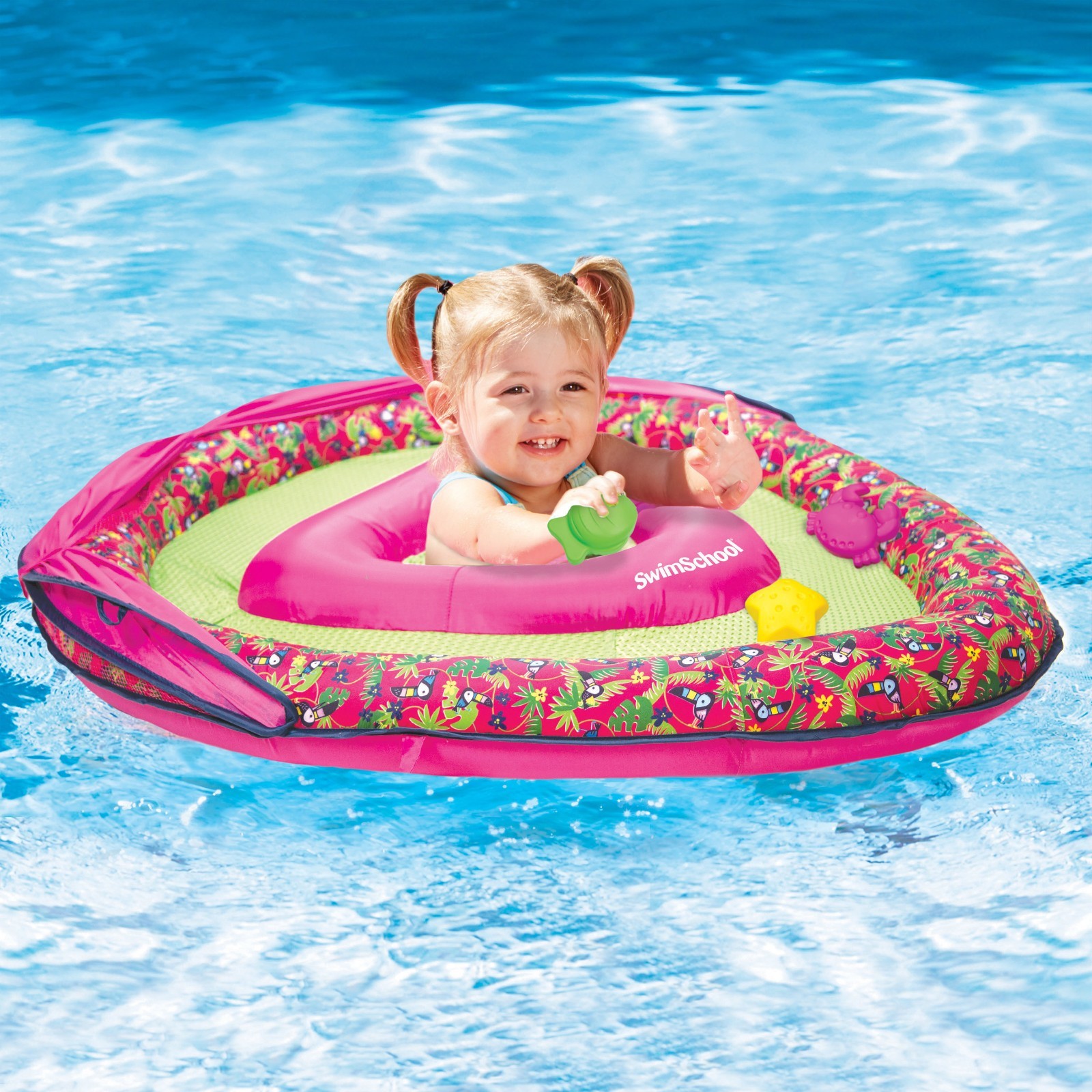Splash and play! The SwimSchool Toys & Joys BabyBoat introduces baby to the water in brightly colored float and three play toys with the Perfect Fit adjustable seat. The seat easily adjusts your baby to a comfortable level in the water for play and fun. Our fabric babyboat features an extra wide base for added stability, UPF50+ retractable canopy, and mesh play area, which makes this float the perfect way to enjoy the water. The Perfect Fit BabyBoat is a key part of the SwimSchool Training System by Aqua-Leisure. * SwimSchool, Level 1 Introducing Baby to Water* Recommended for children 6-24 months* SwimSchool exclusive Perfect Fit Seat adjustable seat to lift baby to a comfortable level in the water* Brightly colored sunshade BabyBoat includes 3 playful toys* UPF50+ retractable canopy shades baby from the suns harmful rays* Easily inflatable and portable* Inflated size is 33 x 38 (84cm x 96cm)